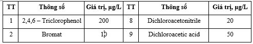 Ở Việt Nam, QCVN 01-1:2018/BYT quy định giá trị tối đa của các thông số nhóm B về hóa chất khử trùng và sản phẩm phụ của nó trong nước sinh hoạt nêu trong bảng sau: