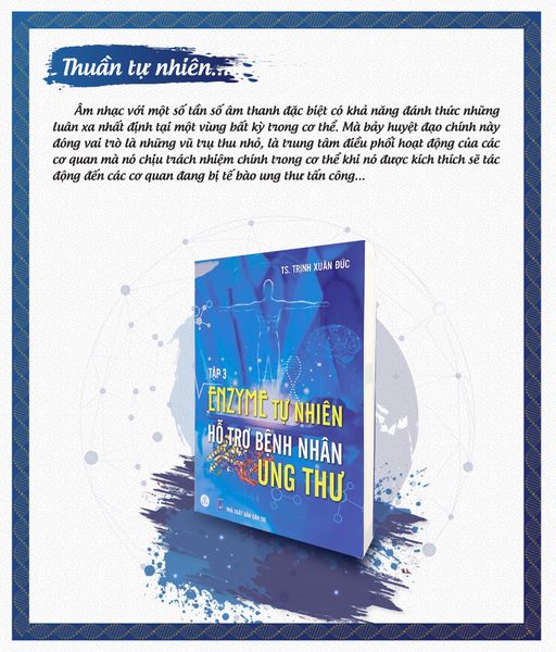 Âm nhạc với một số tần số âm thanh đặc biệt có khả năng đánh thức những luân xa nhất định tại một vùng bất kỳ trong cơ thể. Mà bảy huyệt đạo chính này đóng vai trò là những vũ trụ thu nhỏ, là trung tâm điều phối hoạt động của các cơ quan mà nó chịu trách nhiệm trong cơ thể khi nó được kích thích sẽ tác động đến các cơ quan đang bị tế bào ung thư tấn công. Có bao giờ bạn tự hỏi tại sao mỗi lần nghe nhạc vui mình cảm thấy hưng phấn, yêu đời còn nghe một bản nhạc buồn thì tâm trạng chùng theo, đi xuống? Tiêu đề cuốn sách “Enzyme tự nhiên hỗ trợ bệnh nhân ung thư” ắt hẳn sẽ khiến nhiều độc giả tò mò. Vậy có gì trong cuốn sách đang bán chạy này? Phương pháp Dr.Enzyme hỗ trợ bệnh nhân ung thư và các công thức đồ ăn, thức uống tốt nhất cho quá trình điều trị bệnh ung thư đã được chia sẻ một cách vô cùng chi tiết trong cuốn sách thứ 3 này, bên cạnh đó cuốn sách còn giải mã nguyên lý, cơ chế chữa bệnh tự nhiên của ADN, cung cấp kiến thức về các nguồn năng lượng tự nhiên để chữa bệnh.
